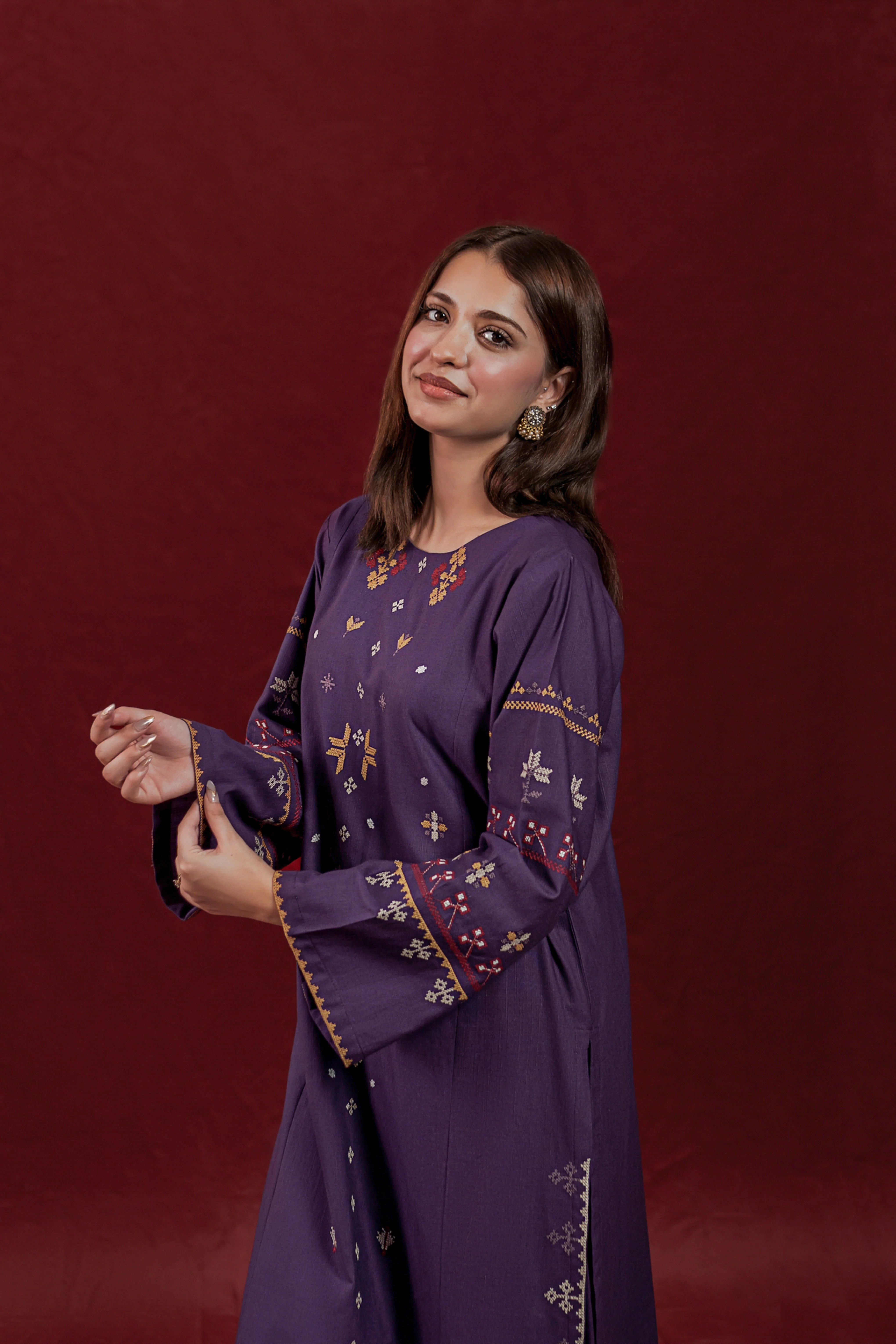 This ready-to-wear 2-piece Khaddar suit features a long shirt adorned with intricate embroidery motifs on the front and sleeves, showcasing skilled craftsmanship. The ensemble is completed with loose embroidered trousers, providing both comfort and elegance. Crafted from warm Khaddar fabric, it is ideal for cooler seasons while reflecting traditional design with a contemporary touch.