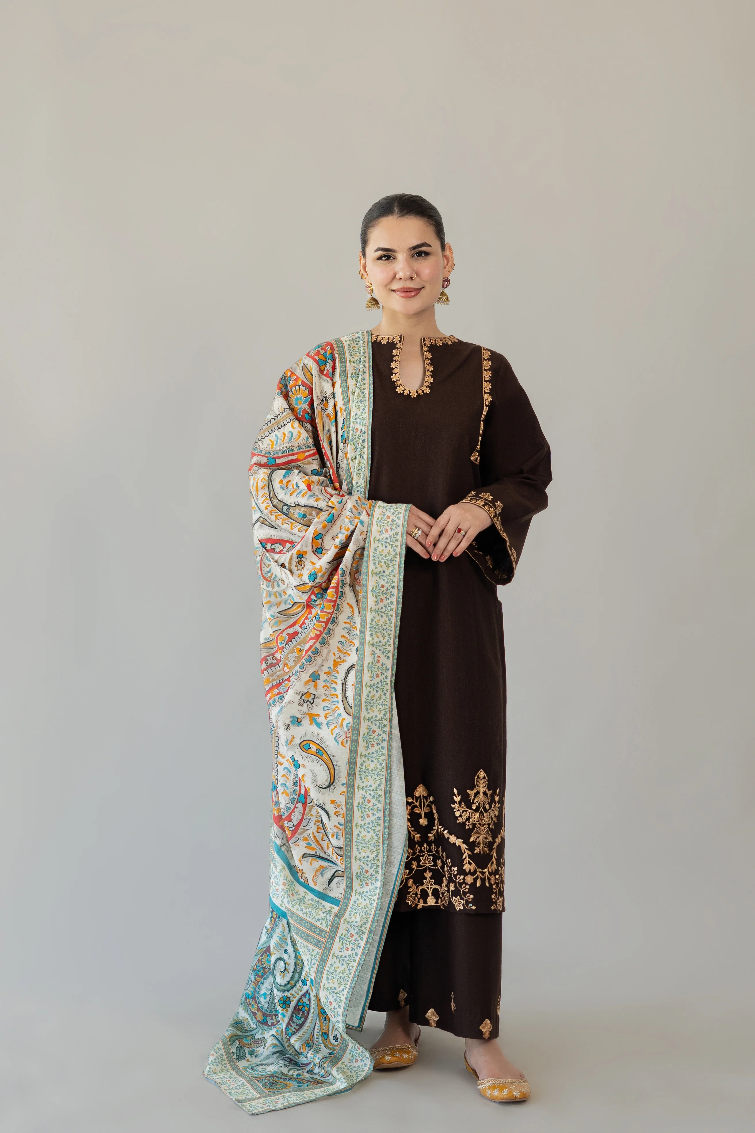 Elevate your seasonal wardrobe with BLOOM, a sophisticated three-piece khaddar ensemble designed for effortless elegance. The extended shirt features intricate embroidery across the front and sleeves, paired with relaxed embroidered trousers for refined comfort. Complete the look with a coordinating printed shawl that ties the collection together.