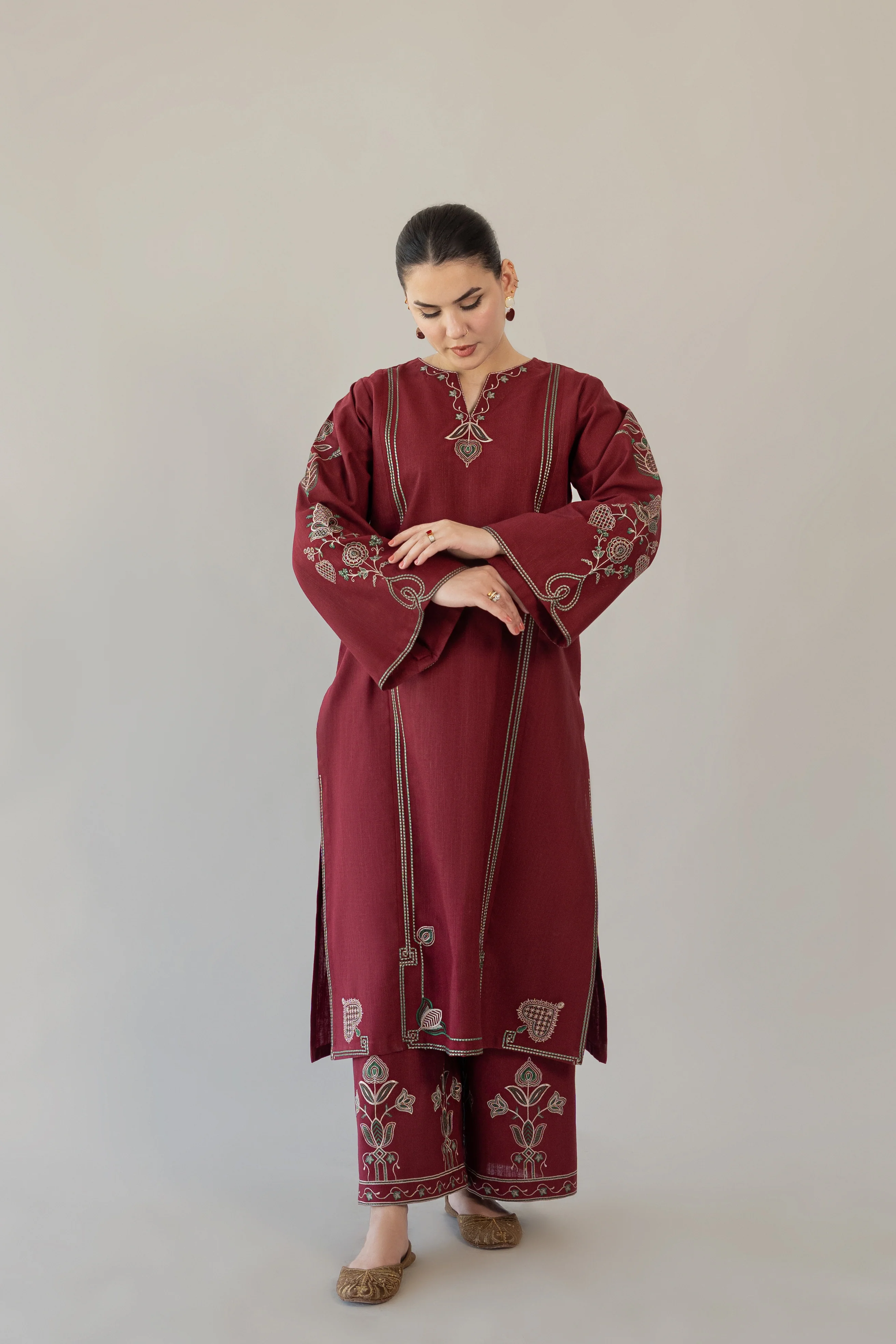 Elevate your seasonal wardrobe with this sophisticated 3-piece khaddar suit. The ensemble features a gracefully tailored long shirt adorned with intricate embroidery across the front and sleeves, paired with relaxed-fit embroidered trousers for effortless comfort. Complete the look with a coordinating printed shawl that adds dimension and versatility. Crafted from premium khaddar fabric, this ready-to-wear set delivers refined elegance for any occasion.