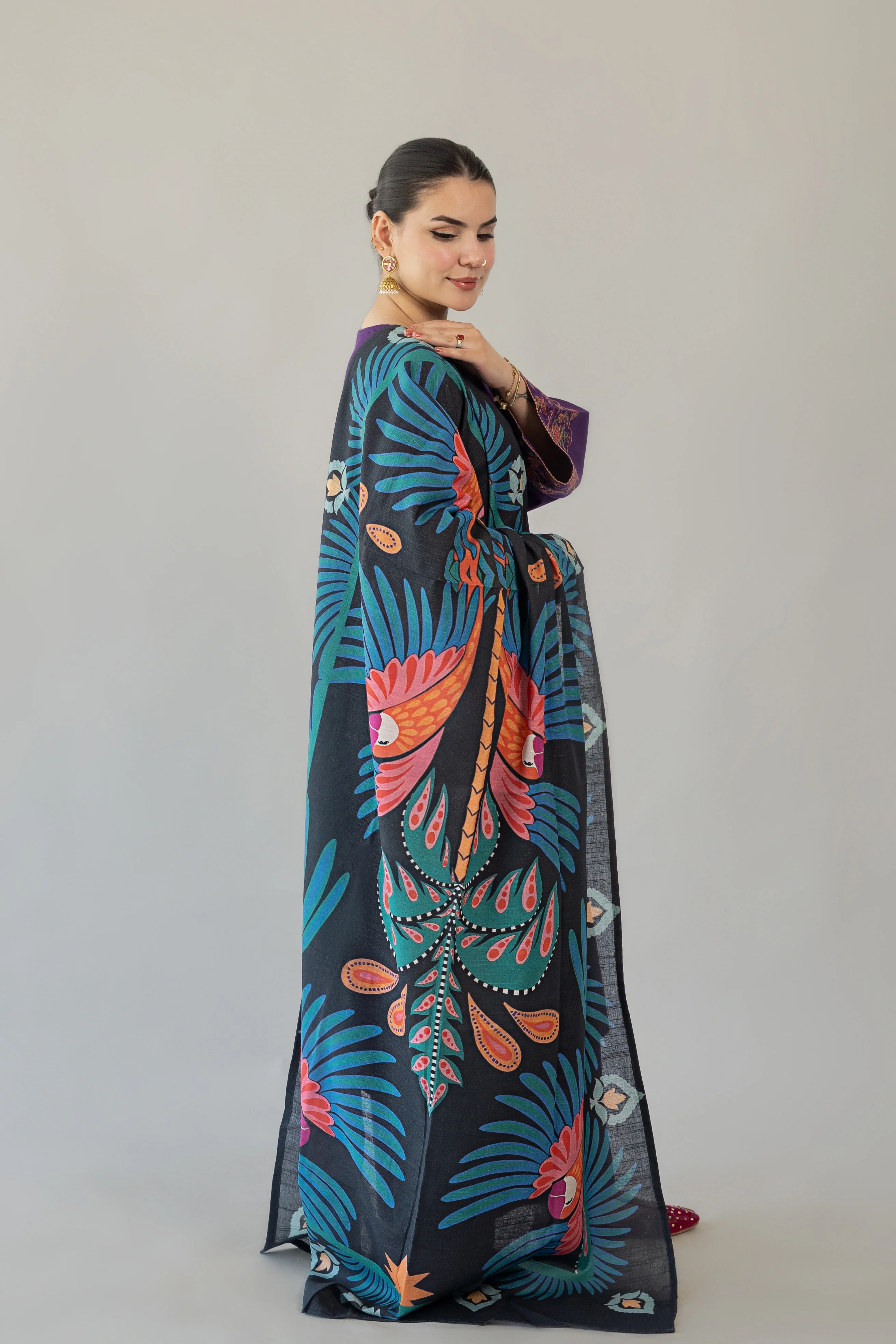 DUSK is a sophisticated 3-piece ready-to-wear khaddar suit designed for effortless elegance. The ensemble features a long shirt adorned with intricate embroidery detailing on the side panels and sleeves, paired with relaxed-fit trousers for comfortable movement. A coordinating printed shawl completes the look, offering versatility for layering. Crafted from premium khaddar fabric, this collection piece balances traditional craftsmanship with contemporary silhouettes.