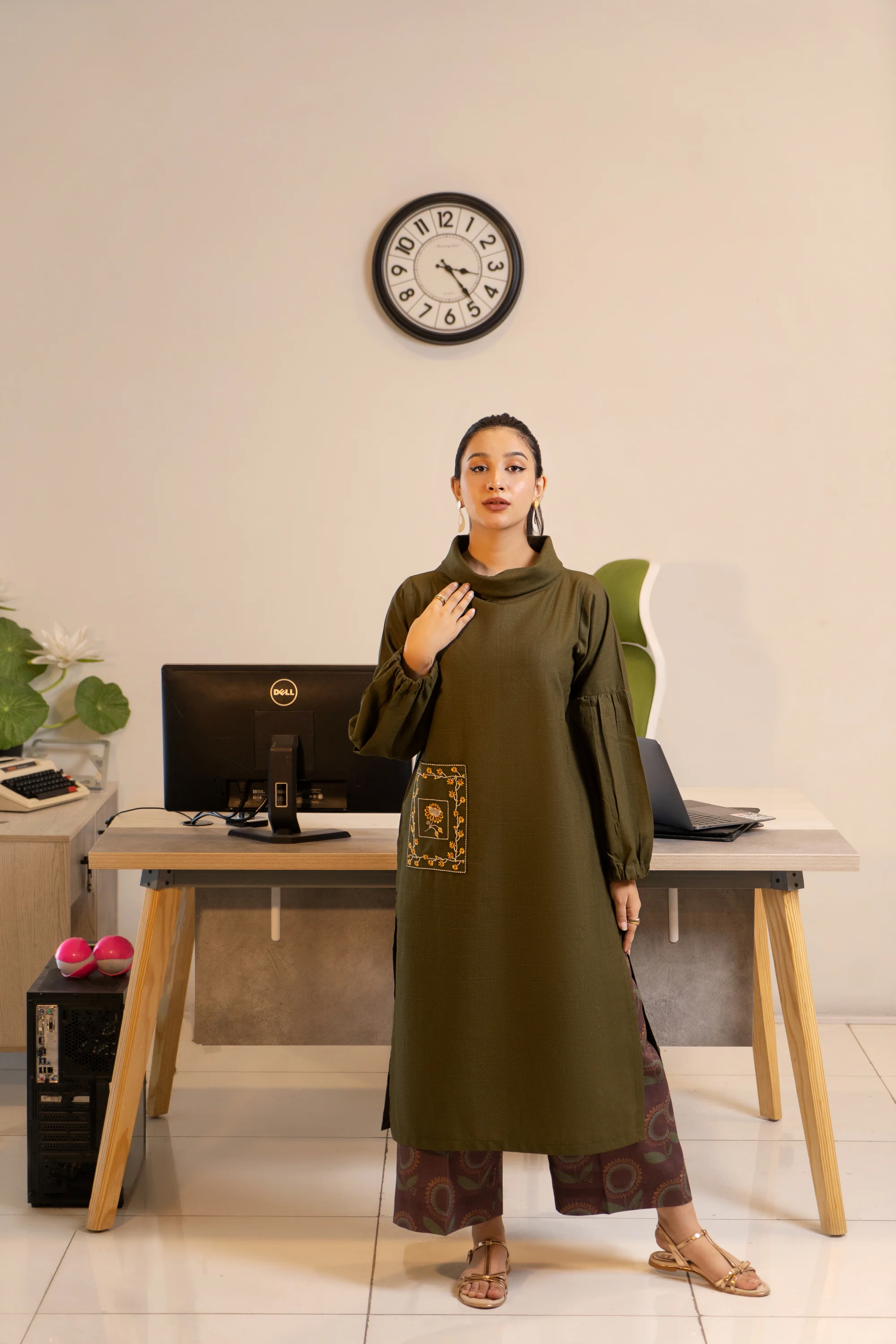 Stay cozy and stylish this winter with our FREEDOM FIT 2-piece khaddar suit. The cowl neck shirt offers a loose fit and convenient pocket with elegant embroidery. Paired with printed trousers for a modern look. Perfect for a ready-to-wear winter ensemble.