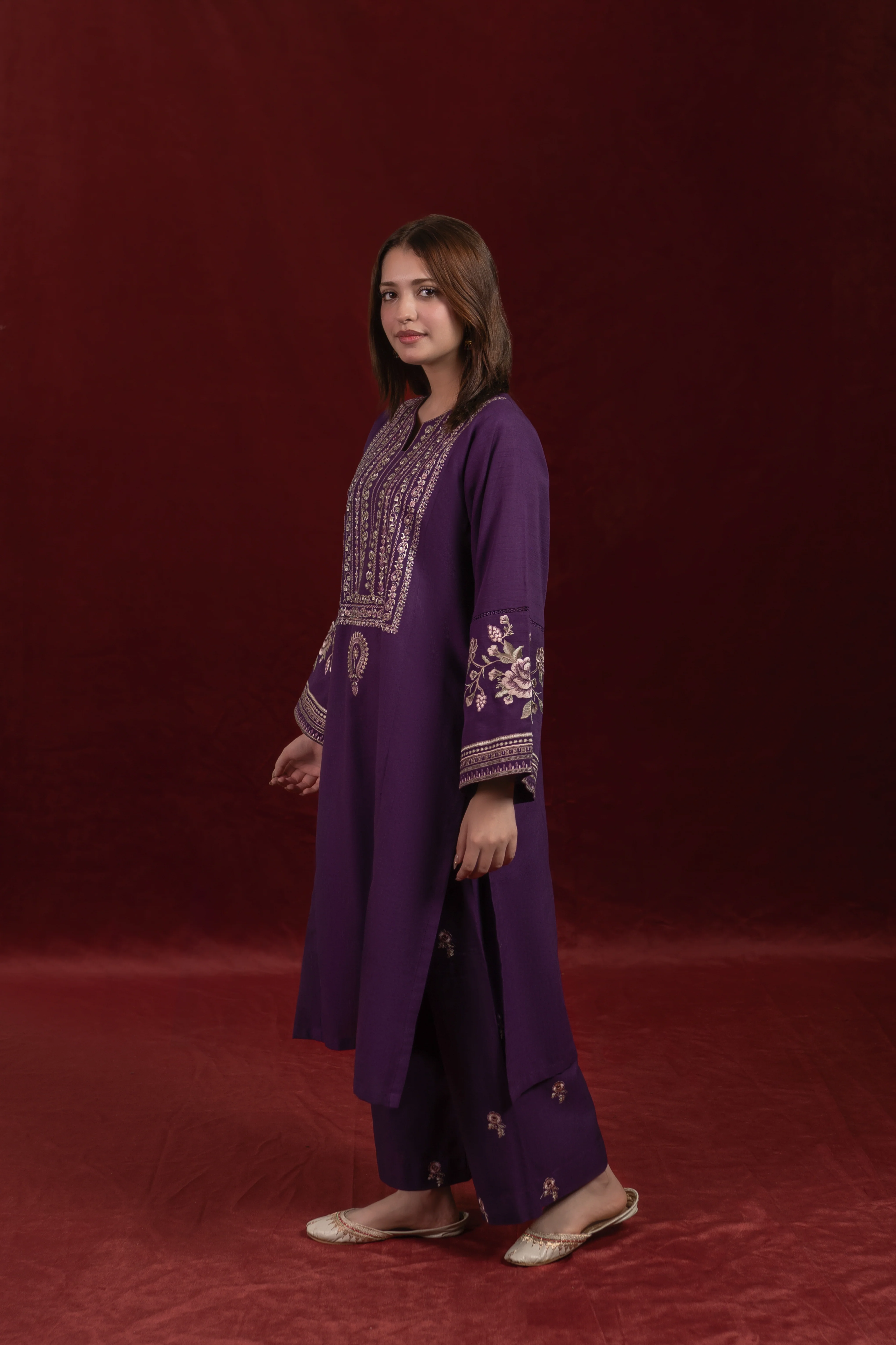This ready-to-wear 2-piece Khaddar suit combines comfort with elegance. The long shirt features intricate embroidery along the neckline, enhanced by a delicate floral motif on the sleeves, showcasing expert craftsmanship. Paired with loose embroidered trousers, this ensemble offers both style and ease, perfect for sophisticated yet comfortable daily wear.