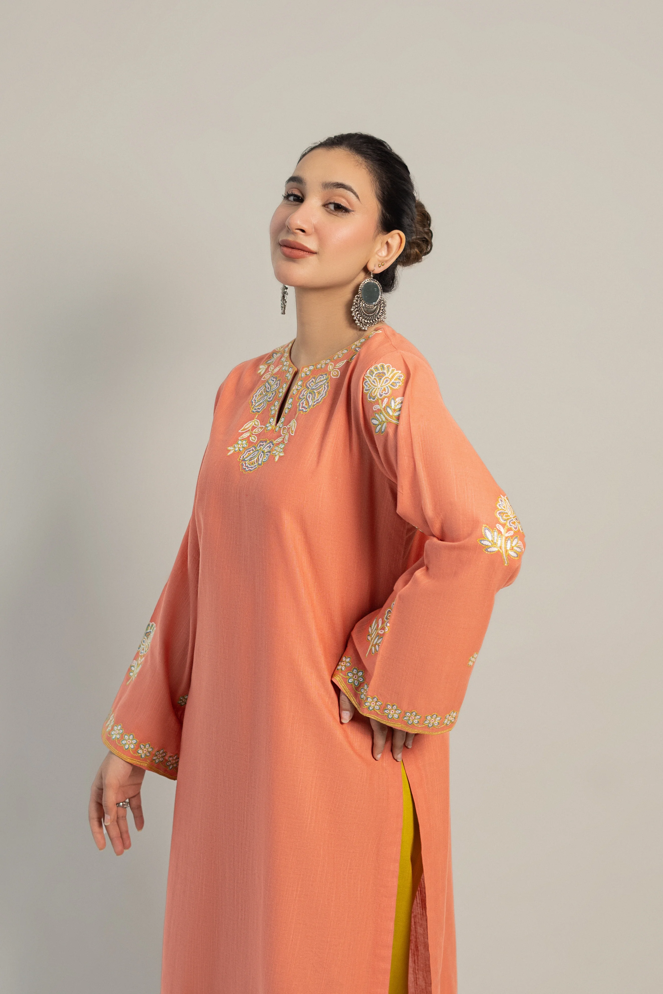 NOUROZ is a sophisticated ready-to-wear 2-piece khaddar suit designed for effortless elegance. The ensemble features a long shirt adorned with intricate embroidery across the front and sleeves, paired with loose-fitting trousers in a contrasting embroidered finish. Crafted from premium khaddar fabric, this collection piece balances traditional craftsmanship with contemporary silhouettes ideal for seasonal wear and special occasions.