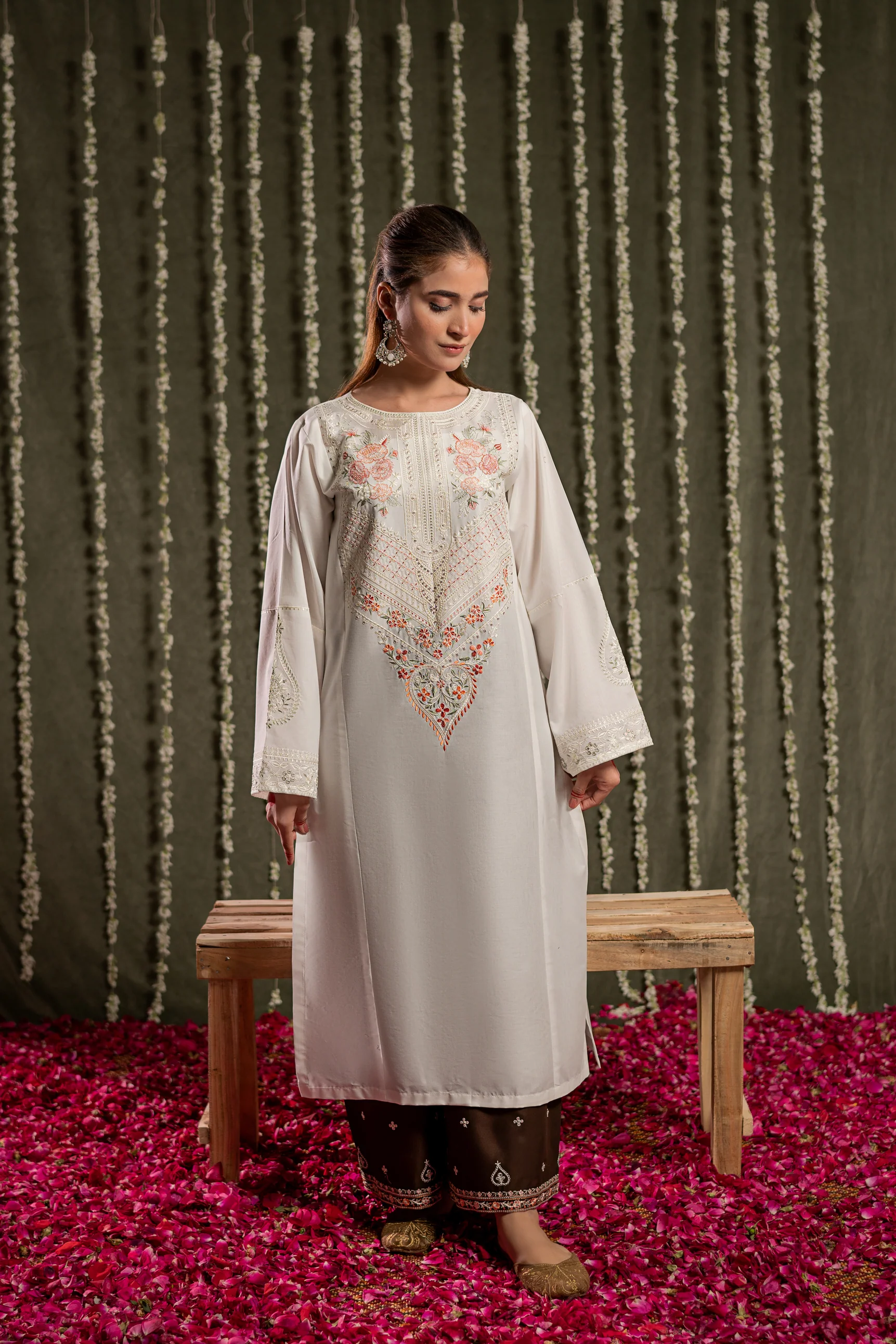 This SURMAYI 2pc embroidered lawn suit is perfect for any occasion. The white shirt features intricate self-colored embroidery on the front and sleeves, with a complementary touch of tilla. Accompanied by contrasting, loose embroidered trousers, this outfit is ready to wear and impress.