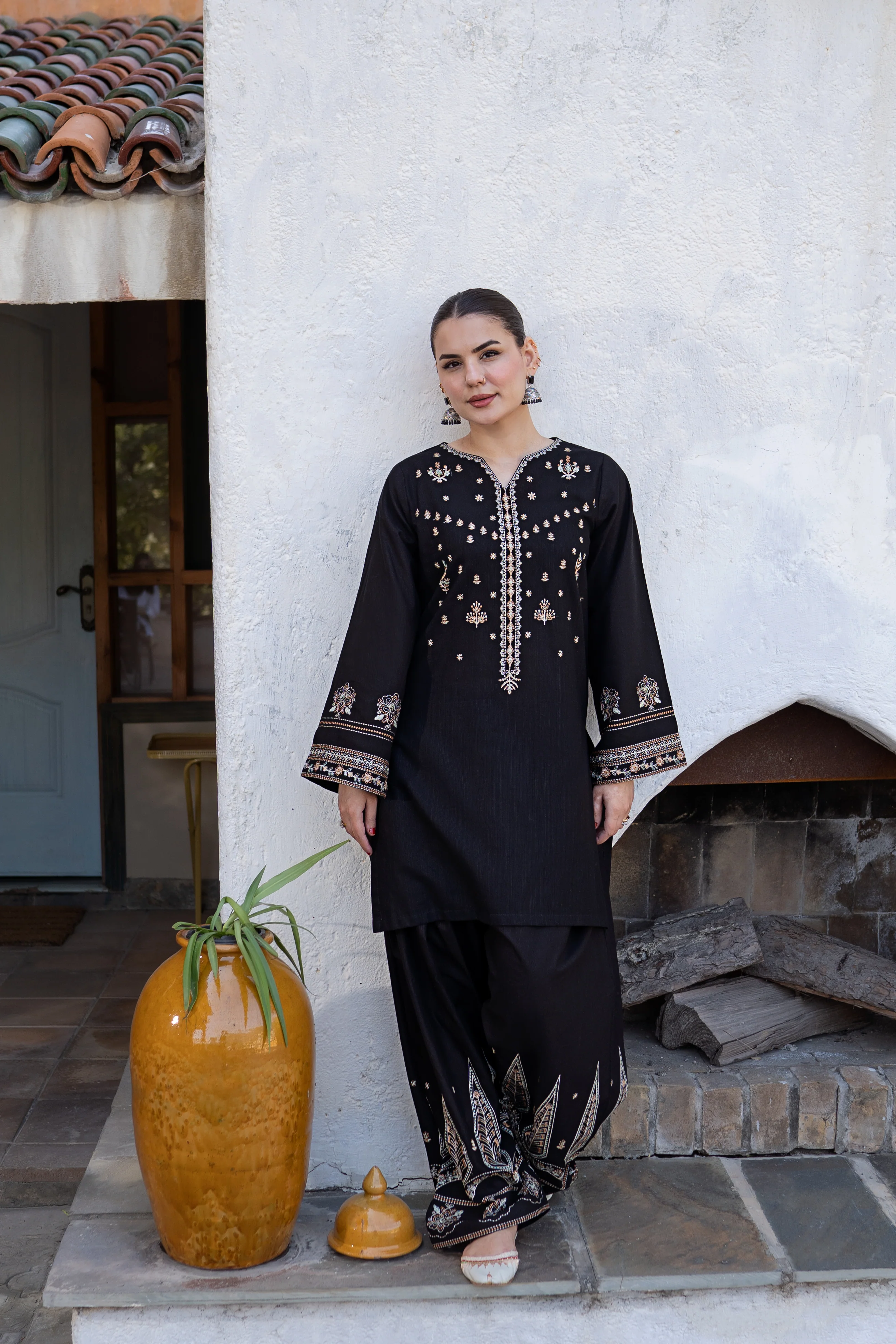 Elevate your wardrobe with this stunning ready-to-wear 3-piece khaddar suit. The short shirt features intricate embroidery across the front neckline and sleeves, paired with a loose, embroidered farshi shalwar for effortless comfort and grace. Complete the look with a contrasting embroidered shawl that adds sophistication to any occasion. Perfect for weddings, celebrations, or everyday elegance.