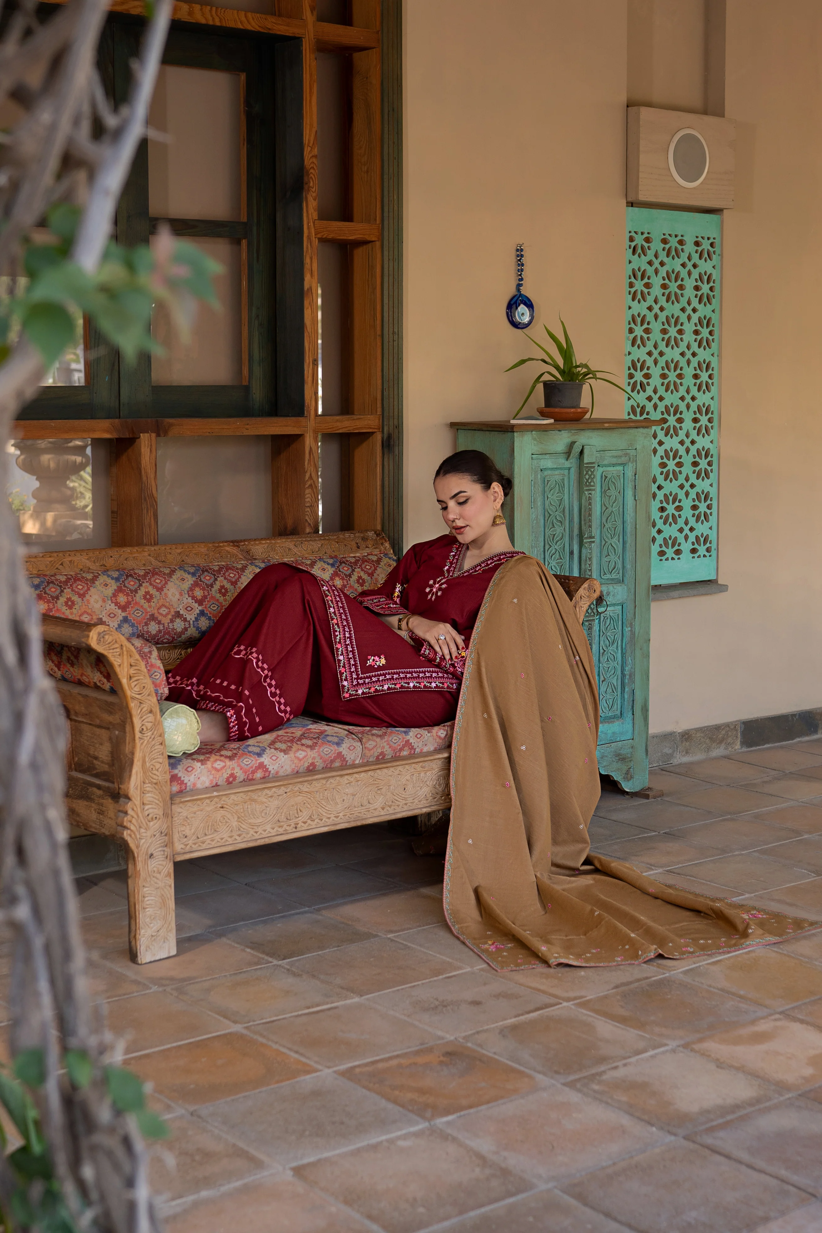 Elevate your wardrobe with this exquisite ready-to-wear 3-piece khaddar suit. The ensemble features a short shirt adorned with intricate embroidery across the front and sleeves, paired with a loose, elegantly embroidered farshi shalwar. A contrasting embroidered shawl completes the sophisticated look. Perfect for celebrations and special occasions, this thoughtfully designed set combines traditional craftsmanship with contemporary style, offering effortless elegance without compromising on detail.